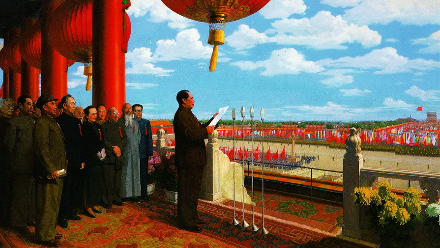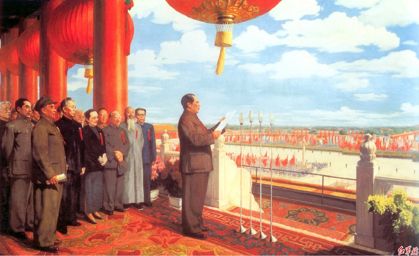 董希文1954年《開國大典》 前排從左至右依次是:朱德、劉少奇、宋慶齡、李濟深、張瀾