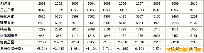 下表是白銀在以前年份的需求情況: