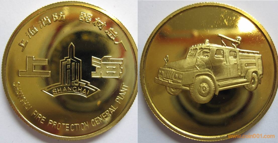 80年代制造,黃銅精制30mm,上幣發(fā)行。正面為主題文字,反面為消防車(chē)。