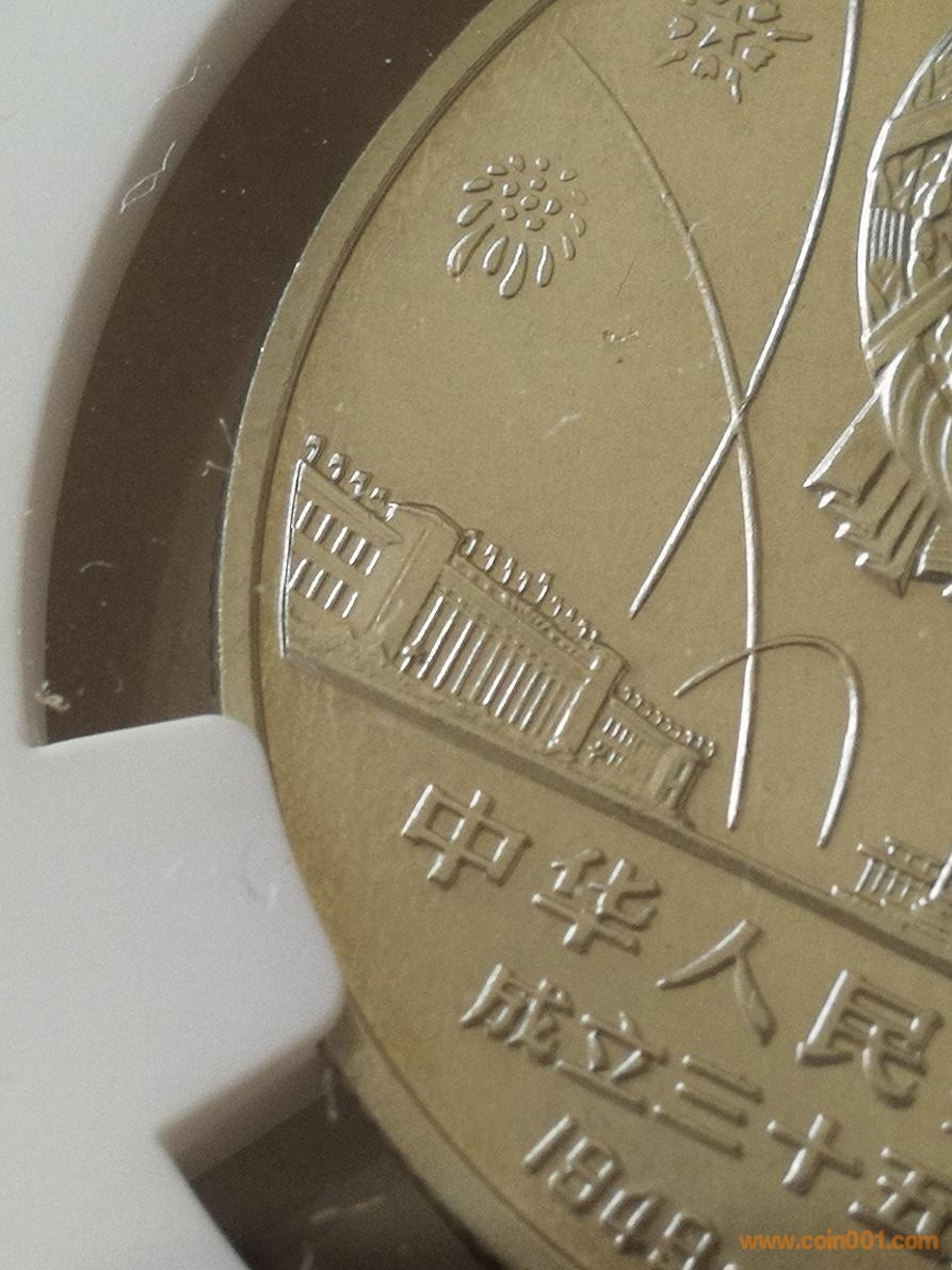 以發(fā)行量稀少初鑄版大典為例,描述一下版別特征:1、直角邊、之字云鴨嘴長,沈陽版特征;2、底板鏡面效果明顯,接近精制幣(NGC個別PF標有初鑄幣),與普制幣有明顯區(qū)別;3、國徽面左下弧線未接觸邊框;4、國徽面左側第四根旗無桿或半桿,如圖所示。此枚為正宗初鑄大典,價格1000元到付。