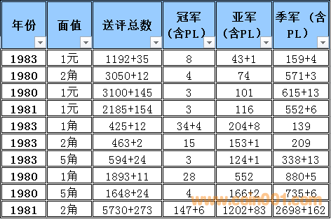 普制長城幣評(píng)級(jí)難度排序2015-12 普制長城幣評(píng)級(jí)難度排序與早期分幣難度排序有明顯的區(qū)別,為了能體現(xiàn)難度系數(shù)的準(zhǔn)確性和科學(xué)性在計(jì)算時(shí)考慮的因素相對(duì)要復(fù)雜一些,主要參考了評(píng)級(jí)的總數(shù),均值比(送評(píng)總數(shù)),冠亞季軍總數(shù),均值比(冠亞季總數(shù))等數(shù)據(jù)作為計(jì)算的主要依據(jù),同時(shí)各個(gè)均值段的補(bǔ)償方法也比較復(fù)雜 首先我們需要討論評(píng)級(jí)幣的價(jià)格構(gòu)成 評(píng)級(jí)幣的價(jià)格構(gòu)成 裸幣的價(jià)格+評(píng)級(jí)溢價(jià)+評(píng)級(jí)費(fèi)用=評(píng)級(jí)幣的參考價(jià)格 主要可以參考以下2個(gè)因數(shù), 第一個(gè)因素為裸幣本生的價(jià)格(它的價(jià)格變動(dòng)主要依據(jù)裸幣成交價(jià)格的變動(dòng)而變動(dòng)與評(píng)級(jí)溢價(jià)之間的關(guān)系不大) 舉例來說: 裸幣的價(jià)格上漲1倍評(píng)級(jí)難度系數(shù)沒有變化的話,評(píng)級(jí)幣的價(jià)格應(yīng)該相應(yīng)的上漲1倍+溢價(jià)+評(píng)級(jí)費(fèi)用=評(píng)級(jí)幣的參考價(jià)格,裸幣的價(jià)格的上漲只能帶動(dòng)評(píng)級(jí)幣裸幣部分的上升,裸幣價(jià)格下跌,評(píng)級(jí)難度系數(shù)沒有變化的話,評(píng)級(jí)幣的價(jià)格為裸幣下跌的價(jià)格+溢價(jià)+評(píng)級(jí)費(fèi)用=評(píng)級(jí)幣的參考價(jià)格,裸幣的價(jià)格的下跌只能帶動(dòng)評(píng)級(jí)幣裸幣部分的下跌 第二個(gè)因素為評(píng)級(jí)難度所產(chǎn)生的一個(gè)溢價(jià) 難度系數(shù)越高它對(duì)應(yīng)的溢價(jià)就越高。溢價(jià)變化主要依據(jù)評(píng)級(jí)難度系數(shù)與系數(shù)平均值的變化和對(duì)比來決定,溢價(jià)水平的上升在一定的程度上會(huì)提升高品質(zhì)裸幣的價(jià)格(卷光卷拆的硬幣)和品相的稀缺性,裸幣價(jià)格的下跌,如果評(píng)級(jí)難度提高的話評(píng)級(jí)幣的價(jià)格反而有可能會(huì)上升,從以上的結(jié)果可以得出下列結(jié)論,溢價(jià)是評(píng)級(jí)價(jià)格體系當(dāng)中最重要的組成部分,溢價(jià)和裸幣的價(jià)格體系完全是獨(dú)立的,之間的價(jià)格沒有直接的聯(lián)系 備注:關(guān)于這個(gè)數(shù)據(jù)的準(zhǔn)確性在設(shè)計(jì)這個(gè)表的時(shí)候我已經(jīng)考慮到了一個(gè)重評(píng)的可能性所以我只取冠,亞,季軍作為一個(gè)參考并同時(shí)設(shè)計(jì)了一個(gè)補(bǔ)償方案,重評(píng)從時(shí)間和金錢的角度來衡量的話不是非常經(jīng)濟(jì)且還存在一定的風(fēng)險(xiǎn),但是從長遠(yuǎn)看不能排除這個(gè)因數(shù)。雖然將來會(huì)產(chǎn)生一些誤差,但我認(rèn)為誤差不會(huì)太大尤其在高分段和稀缺性的錢幣,對(duì)于普制長城幣來說NGC已經(jīng)作為收藏的主流其數(shù)據(jù)的準(zhǔn)確性還是比較值得信賴的。 采樣的范圍 取樣范圍:1980-1985 普制長城幣 難度排序的選擇標(biāo)準(zhǔn):送評(píng)總數(shù)的平均值高于100%的普制長城幣,低于100%的數(shù)據(jù)將不體現(xiàn)在難度排序中 計(jì)算公式: 評(píng)級(jí)總數(shù)/均值=均值比 考慮到1983年長城幣存世量明顯低于其他年份的普制長城幣,1983年的數(shù)據(jù)將保留和計(jì)入到難度排序中,大家可以通過下面的圖表黃色部分發(fā)現(xiàn)被刪除的年份主要是送評(píng)溢價(jià)不高的年份,如果未來送評(píng)量穩(wěn)步上升的話,它將加入到采樣的范圍. 備:這個(gè)采樣的范圍會(huì)有一定的誤差,我將根據(jù)均值比的變化每個(gè)季度第一周進(jìn)行適當(dāng)?shù)恼{(diào)整,由于普制長城幣的版別比較復(fù)雜,無法進(jìn)行細(xì)分這里主要以年份為主,請(qǐng)大家諒解! 采樣的數(shù)據(jù)和計(jì)算的依據(jù) 統(tǒng)計(jì)第一檔次每個(gè)年份冠,亞,季的出分?jǐn)?shù)量作為一個(gè)分析依據(jù),為了能更加的量化我用數(shù)字的方法進(jìn)行統(tǒng)計(jì),方法如下: 調(diào)整后的均值比 普制長城幣的計(jì)算方法如下: 綜合值的計(jì)算方法: (送評(píng)總數(shù)均值比+冠亞季總數(shù)均值比)÷2=綜合值 具體計(jì)算方法如下: 均值比在0-50% 冠軍分1枚為1分2枚2分以此類推,亞軍分1枚為2分2枚4分以此類推,季軍1枚為3分2枚6分以此類推 補(bǔ)償方法如下: 如果冠軍分的評(píng)分?jǐn)?shù)量大于總數(shù)(冠,亞,季之和)的15%,冠軍分的1枚為1.5分,如果冠軍分的評(píng)分?jǐn)?shù)量大于總數(shù)(冠,亞,季之和)的50%冠軍分的1枚為2分 如果亞軍分的評(píng)分?jǐn)?shù)量大于總數(shù)(冠,亞,季之和)的35%,亞軍分的1枚為2.5分,如果亞軍分的評(píng)分?jǐn)?shù)量低于總數(shù)(冠,亞,季之和)的25%亞軍分的1枚為1.5分 季軍分的評(píng)分?jǐn)?shù)量大于總數(shù)(冠,亞,季之和)的65%,季軍分的1枚為2.5分, 季軍分的評(píng)分?jǐn)?shù)量大于總數(shù)(冠,亞,季之和)的85%,季軍分的1枚為2分 均值比在50-100% 冠軍分1枚為1分2枚2分以此類推,亞軍分1枚為1.5分2枚3分以此類推,季軍1枚為2分2枚4分以此類推 此范圍+值補(bǔ)償 如果冠軍分的評(píng)分?jǐn)?shù)量大于總數(shù)(冠,亞,季之和)的50%冠軍分的1枚為1.25分 如果亞軍分的評(píng)分?jǐn)?shù)量大于總數(shù)(冠,亞,季
