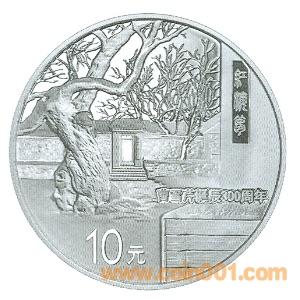 31.104克(1盎司)圓形銀質(zhì)紀(jì)念幣背面圖案為曹雪芹紀(jì)念館景觀與線裝書(shū)籍造型組合,并刊“曹雪芹誕辰300周年”字樣及面額。