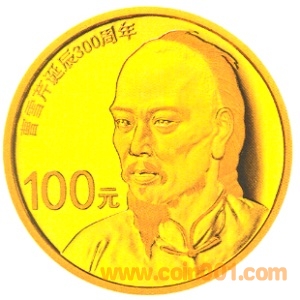 7.776克(1/4盎司)圓形金質(zhì)紀(jì)念幣背面圖案為曹雪芹像,并刊“曹雪芹誕辰300周年”字樣及面額。
