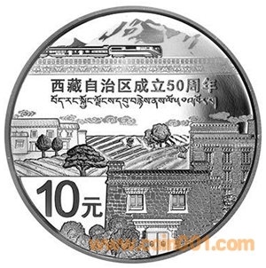 31.104克(1盎司)圓形銀質(zhì)紀(jì)念幣背面圖案為藏式民居景觀和青藏鐵路、雪山等造型組合設(shè)計(jì),并刊“西藏自治區(qū)成立50周年”漢、藏文字樣及面額。