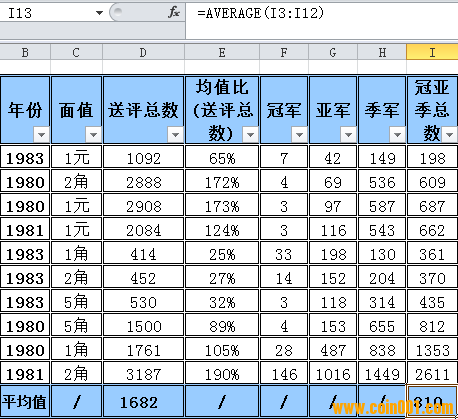 綜合上面兩個問題,我建議:第一,采樣的范圍或者是統(tǒng)計的范圍要調(diào)整,應該以同材質(zhì)及同工藝為標準進行計算,即如1角、2角、5角的普制幣納入一個范圍計算,精制幣又另外一個范圍計算,當然計算結(jié)果還可以互相再比較,進而得出更多的分析結(jié)論。第二,在同一范圍內(nèi),如出現(xiàn)過的最高分即以此為冠軍分,而不是以單項最高分為冠軍分,單項如無冠軍分的則計算公式里為0.——具體的計算我還沒試過,如周版您覺得也不錯可以利用原來的計算表試算一下,看看結(jié)果是否更切合實際?