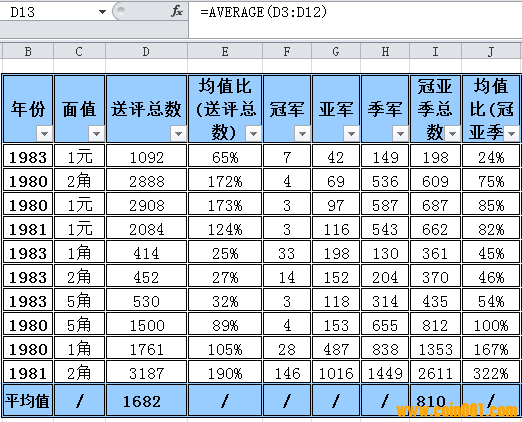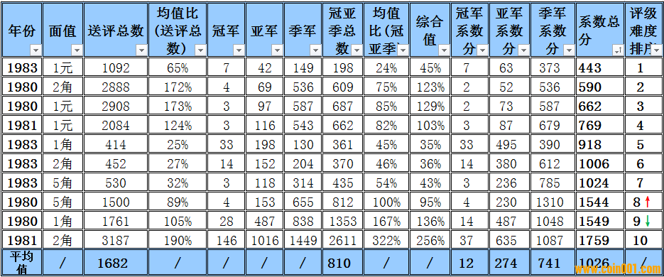 但回頭看,我還是有兩點疑問:1、計算總數(shù)和均值為什么是選這10項?——按你的說法是“送評總數(shù)的平均值高于100%的普制長城幣,低于100%的數(shù)據(jù)將不體現(xiàn)在難度排序中”,這句話我不太理解。引申來看是,如果我要計算的是所有的評級幣,那么采樣的標準或者說進入排序的方式又是怎樣呢?