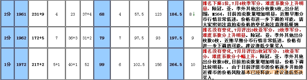 備:這個(gè)采樣的范圍會(huì)有一定的誤差,我將根據(jù)市場(chǎng)和評(píng)級(jí)量的變化每個(gè)季度第一周作出適當(dāng)?shù)恼{(diào)整,難度系數(shù)分在未來(lái)如果超過(guò)1000分將剔除。 1960年2分在一塵有大量貨源出現(xiàn),位置由原來(lái)的第一檔次調(diào)整到第二檔次。難度系數(shù)排序暫時(shí)保留,如分?jǐn)?shù)超過(guò)1000分將刪除,請(qǐng)大家留意!