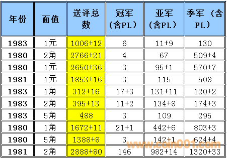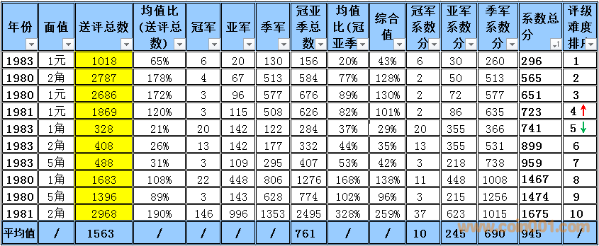 普制長城幣評級難度排序2015-2 普制長城幣評級難度排序與早期分幣難度排序有明顯的區(qū)別,為了能體現(xiàn)難度系數(shù)的準確性和科學(xué)性在計算時考慮的因素相對要復(fù)雜一些,主要參考了評級的總數(shù),均值比(送評總數(shù)),冠亞季軍總數(shù),均值比(冠亞季總數(shù))等數(shù)據(jù)作為計算的主要依據(jù),同時各個均值段的補償方法也比較復(fù)雜 首先我們需要討論評級幣的價格構(gòu)成 評級幣的價格構(gòu)成 裸幣的價格+評級溢價+評級費用=評級幣的參考價格 主要可以參考以下2個因數(shù), 第一個因素為裸幣本生的價格(它的價格變動主要依據(jù)裸幣成交價格的變動而變動與評級溢價之間的關(guān)系不大) 舉例來說: 裸幣的價格上漲1倍評級難度系數(shù)沒有變化的話,評級幣的價格應(yīng)該相應(yīng)的上漲1倍+溢價+評級費用=評級幣的參考價格,裸幣的價格的上漲只能帶動評級幣裸幣部分的上升,裸幣價格下跌,評級難度系數(shù)沒有變化的話,評級幣的價格為裸幣下跌的價格+溢價+評級費用=評級幣的參考價格,裸幣的價格的下跌只能帶動評級幣裸幣部分的下跌 第二個因素為評級難度所產(chǎn)生的一個溢價 難度系數(shù)越高它對應(yīng)的溢價就越高。溢價變化主要依據(jù)評級難度系數(shù)與系數(shù)平均值的變化和對比來決定,溢價水平的上升在一定的程度上會提升高品質(zhì)裸幣的價格(卷光卷拆的硬幣)和品相的稀缺性,裸幣價格的下跌,如果評級難度提高的話評級幣的價格反而有可能會上升,從以上的結(jié)果可以得出下列結(jié)論,溢價是評級價格體系當(dāng)中最重要的組成部分,溢價和裸幣的價格體系完全是獨立的,之間的價格沒有直接的聯(lián)系 備注:關(guān)于這個數(shù)據(jù)的準確性在設(shè)計這個表的時候我已經(jīng)考慮到了一個重評的可能性所以我只取冠,亞,季軍作為一個參考并同時設(shè)計了一個補償方案,重評從時間和金錢的角度來衡量的話不是非常經(jīng)濟且還存在一定的風(fēng)險,但是從長遠看不能排除這個因數(shù)。雖然將來會產(chǎn)生一些誤差,但我認為誤差不會太大尤其在高分段和稀缺性的錢幣,對于普制長城幣來說NGC已經(jīng)作為收藏的主流其數(shù)據(jù)的準確性還是比較值得信賴的。 采樣的范圍 取樣范圍:1980-1985 普制長城幣 難度排序的選擇標(biāo)準:送評總數(shù)的平均值高于100%的普制長城幣,低于100%的數(shù)據(jù)將不體現(xiàn)在難度排序中 計算公式: 評級總數(shù)/均值=均值比 考慮到1983年長城幣存世量明顯低于其他年份的普制長城幣,1983年的數(shù)據(jù)將保留和計入到難度排序中,大家可以通過下面的圖表黃色部分發(fā)現(xiàn)被刪除的年份主要是送評溢價不高的年份,如果未來送評量穩(wěn)步上升的話,它將加入到采樣的范圍. 備:這個采樣的范圍會有一定的誤差,我將根據(jù)均值比的變化每個季度第一周進行適當(dāng)?shù)恼{(diào)整,由于普制長城幣的版別比較復(fù)雜,無法進行細分這里主要以年份為主,請大家諒解! 采樣的數(shù)據(jù)和計算的依據(jù) 統(tǒng)計第一檔次每個年份冠,亞,季的出分數(shù)量作為一個分析依據(jù),為了能更加的量化我用數(shù)字的方法進行統(tǒng)計,方法如下: 調(diào)整后的均值比 普制長城幣的計算方法如下: 綜合值的計算方法: (送評總數(shù)均值比+冠亞季總數(shù)均值比)÷2=綜合值 具體計算方法如下: 均值比在0-50% 冠軍分1枚為1分2枚2分以此類推,亞軍分1枚為2分2枚4分以此類推,季軍1枚為3分2枚6分以此類推 補償方法如下: 如果冠軍分的評分數(shù)量大于總數(shù)(冠,亞,季之和)的15%,冠軍分的1枚為1.5分,如果冠軍分的評分數(shù)量大于總數(shù)(冠,亞,季之和)的50%冠軍分的1枚為2分 如果亞軍分的評分數(shù)量大于總數(shù)(冠,亞,季之和)的35%,亞軍分的1枚為2.5分,如果亞軍分的評分數(shù)量低于總數(shù)(冠,亞,季之和)的25%亞軍分的1枚為1.5分 季軍分的評分數(shù)量大于總數(shù)(冠,亞,季之和)的65%,季軍分的1枚為2.5分, 季軍分的評分數(shù)量大于總數(shù)(冠,亞,季之和)的85%,季軍分的1枚為2分 均值比在50-100% 冠軍分1枚為1分2枚2分以此類推,亞軍分1枚為1.5分2枚3分以此類推,季軍1枚為2分2枚4分以此類推 此范圍+值補償 如果冠軍分的評分數(shù)量大于總數(shù)(冠,亞,季之和)的50%冠軍分的1枚為1.25分 如果亞軍分的評分數(shù)量大于總數(shù)(冠,亞,季之和)的35%,亞軍分的1枚為1.75分 均值比在100-150% 冠軍分1枚為0.5分2枚1分以此類推,亞軍分1枚為1分2枚2分以此類推,季軍1枚為1.5分2枚3分以此類推 補償方法如下: 如果冠軍分的評分數(shù)量大于總數(shù)(冠,亞,季之和)的15%,冠軍分的1枚為0.75分,如果冠軍分的評分數(shù)量大于總數(shù)(冠,亞,季之和)的50%冠軍分的1枚為1分 如果亞軍分的評分數(shù)量大于總數(shù)(冠,亞,季之和)的35%,亞軍分的1枚為1.25分,如果亞軍分的評分數(shù)量低于總數(shù)(冠,亞,季之和)的25%亞軍分的1枚為0.75分 季軍分的評分數(shù)量大于總數(shù)(冠,亞,季之和)的65%,季軍分的1枚為1.25分, 季軍分的評分數(shù)量大于總數(shù)(冠,亞,季之和)的85%,季軍分的1枚為1分 均值比在150%-180% 冠軍分1枚為0.5分2枚1分以此類推,亞軍分1枚為0.75分2枚1.5分以此類推,季軍1枚為1.25分2枚2.5分以此類推 如果冠軍分的評分數(sh