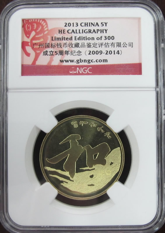 禮品幣為2013年和字號(hào)紀(jì)念幣伍圓,并采用具有喜慶意義的馬年紅色標(biāo)簽,NGC限量300枚。
