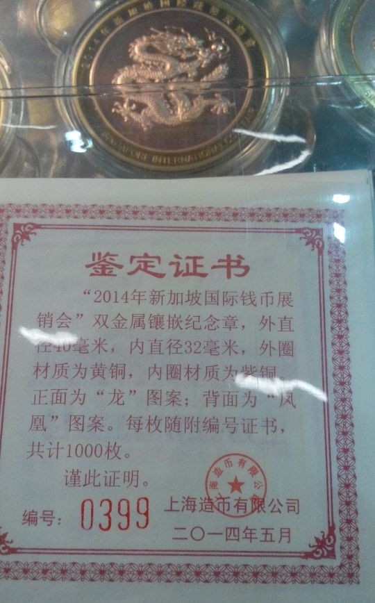 上海造幣廠-2014年-新加坡國際錢幣展銷會龍鳳紀念章,300元/枚
