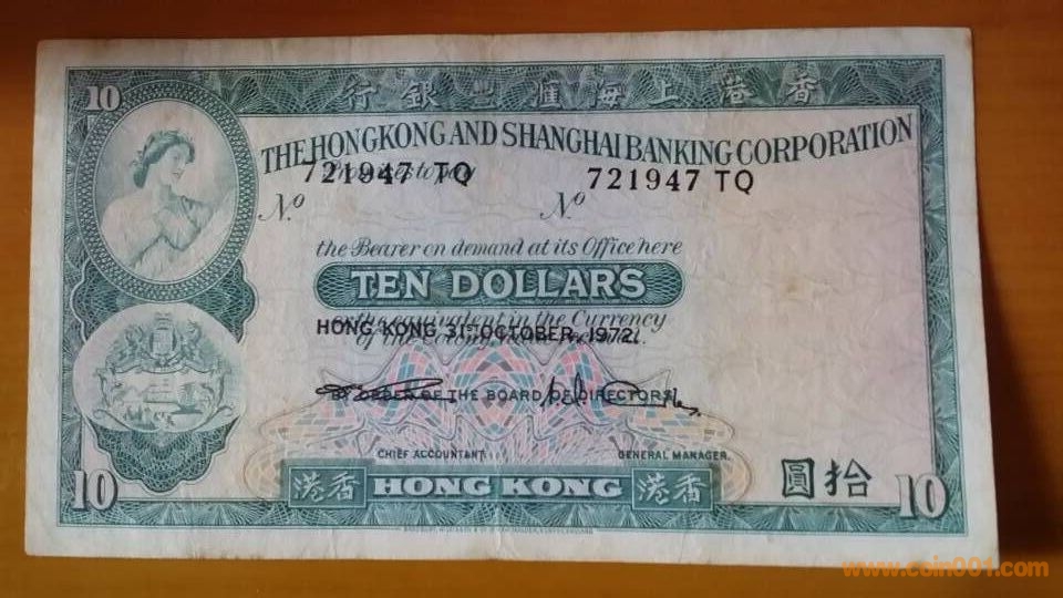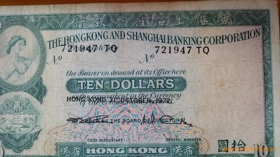 1)【錯(cuò)幣,號(hào)碼,日期,簽名,大幅度向上移位。非常明顯,】1972年匯豐拾元,721947TQ,八品。包真。2800元