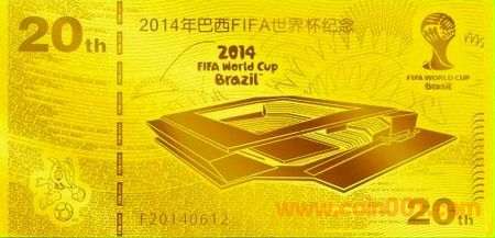 2014年巴西FIFA世界杯即將開幕,為紀(jì)念這一盛事,特別發(fā)行的《2014年巴西FIFA世界杯純金紀(jì)念》在中國大陸地區(qū)由浦發(fā)銀行獨(dú)家發(fā)行,全國浦發(fā)銀行網(wǎng)點(diǎn)同步接受預(yù)訂。據(jù)介紹,“純金紀(jì)念”以2克Au.999純金打造,產(chǎn)品正面主要采用2014年巴西FIFA世界杯會(huì)徽、吉祥物及比賽場館圖案;反面主要采用2014年巴西FIFA世界杯會(huì)徽及運(yùn)動(dòng)員剪影圖案。產(chǎn)品包裝采用特種水印防偽功能的人民幣專用紙,每套產(chǎn)品一對一配有國際足聯(lián)特許授權(quán)的官方防偽標(biāo)簽和收藏證書。