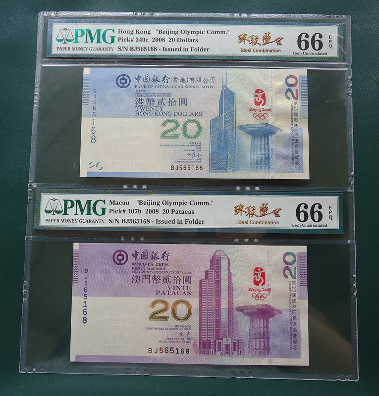 PMG 66分 珠聯(lián)璧合 港澳奧運(yùn)鈔 BJ 565168 同冠+全同號(hào)+尾168一路發(fā) 惜售8800元!