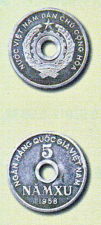 關(guān)于硬幣:1957年,代鑄硬幣面值有1分、2分、5分種3種,合金成份含鋁98.8%、錳0.2%、鎂1%。這一套硬鋪幣除大小不同外,幣面設(shè)計(jì)完全一樣,皆為圓形圓孔。正面是一個(gè)以齒為核心,外繞以綬帶捆扎的谷穗,孔上方為五角星組成的圖案,其外環(huán)繞以越文“越南民主共和國”;背面周邊為越文“越南國家銀行”和紀(jì)年“1957”或“1958”,其中為面值。