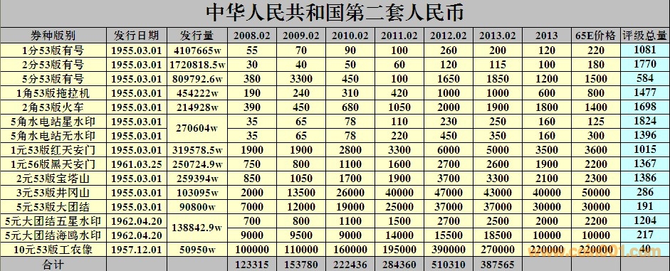 引用 引用第3樓仲雨于2014-01-08 12:29發(fā)表的 : 看到這個(gè)表格,我覺(jué)得可以往深入再想一想: 評(píng)級(jí)量排序: 大黑十、紅五元、海鷗水印、綠三元、長(zhǎng)號(hào)五分、紅一元、長(zhǎng)號(hào)一分、黃五元、黑一元、寶塔山、深版水壩、黃一角、火車頭、長(zhǎng)號(hào)二分、淺版水壩