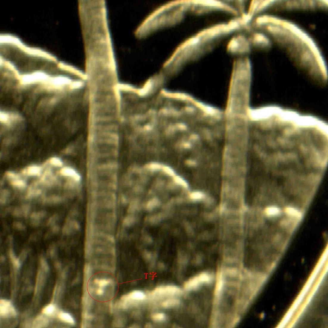 縮鑄造技術(shù)刻上了寶島臺灣四字的漢語拼音“BAO?? DAO?? TAI????WAN”微縮字母;其次,在該幣背面的不同的地方,均藏有字母“T”的暗記符號,分別為: