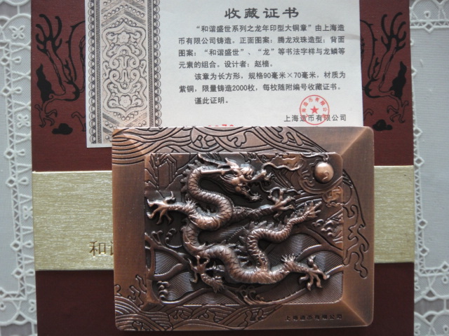 售上幣廠新發(fā)《和諧盛世系列之龍年印型大銅章》,2012年發(fā)行
