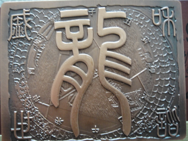 該銅章背面圖案為“和諧盛世”、“龍”等書法字樣與龍鱗等元素的組合。