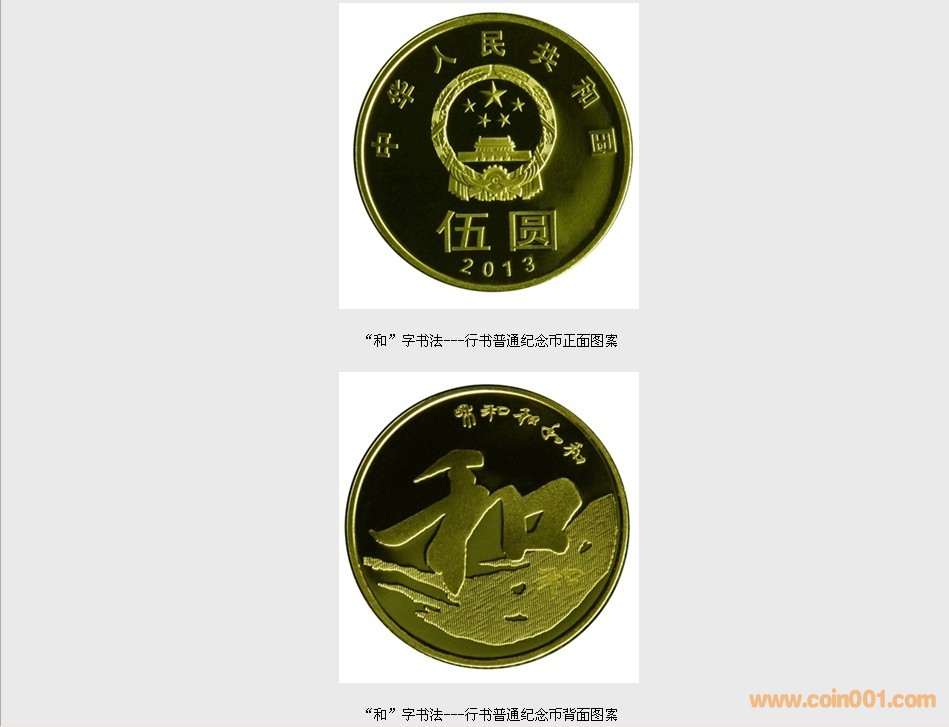 “和”字書法---行書普通紀念幣正面主景圖案為中華人民共和國國徽,內(nèi)緣上方刊“中華人民共和國”國名、下方刊面額“伍圓”及年號“2013”;背面主景圖案為“和”字的行書書法,襯景圖案為書法的飛白,內(nèi)緣右上方刊“和”字的五種書法體。