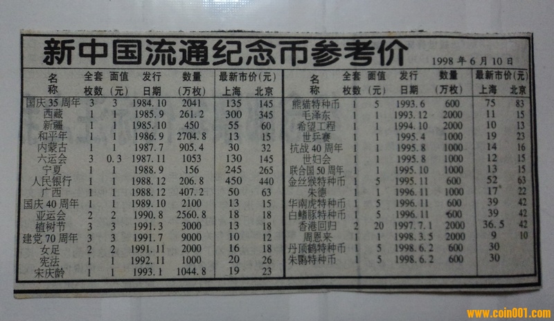 引用 引用第15樓趙一新于2013-02-02 21:29發(fā)表的 : 上張十幾年前揚(yáng)子晚報(bào)上紀(jì)念幣報(bào)價(jià)表,只有少數(shù)品種進(jìn)步了,大多數(shù)還在原地踏步,這個(gè)價(jià)格還不太高,97年好像還要高,我買了套卷拆全品建國(guó)35和西藏花了900元。 我想是大多數(shù)藏友對(duì)普通紀(jì)念幣灰心的原因 。 [attachment=56335]