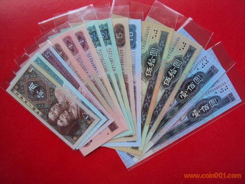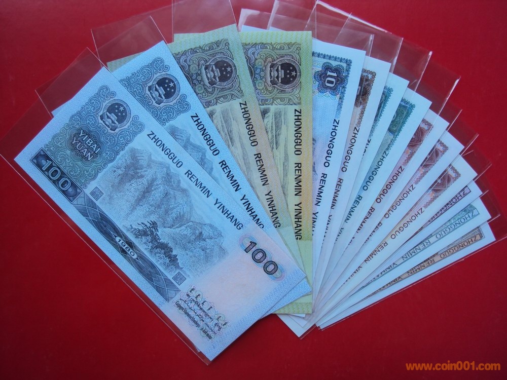 備注:1)80版+90版100元劵各一枚;(2)80版+90版50元劵各一枚;80版50元(第四人民幣鈔王,罕見)(3)80版10元劵一枚;(4)80版5元劵一枚;(5)80版+90版2元劵各一枚;(6)80版+90版+96版1元劵各一枚;(7)80版五角劵一枚;(8)80版兩角劵一枚;(9)80版一角劵一枚;(10)紙分幣三張.