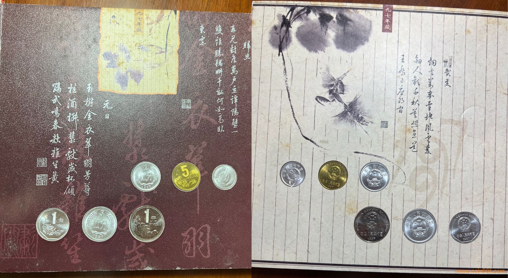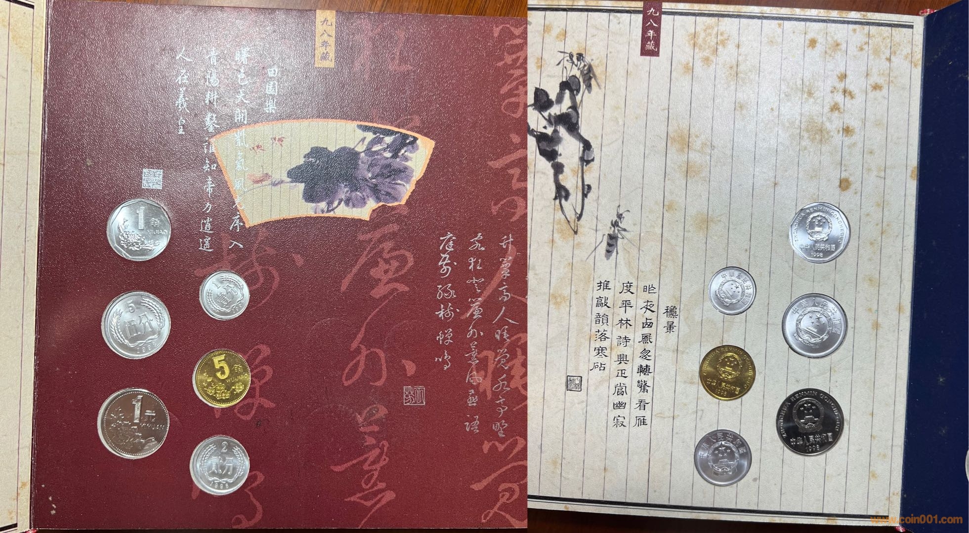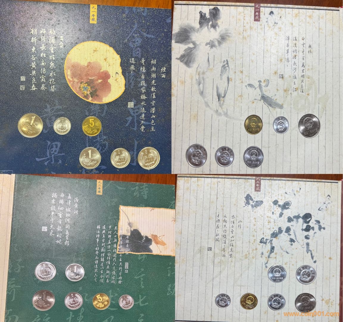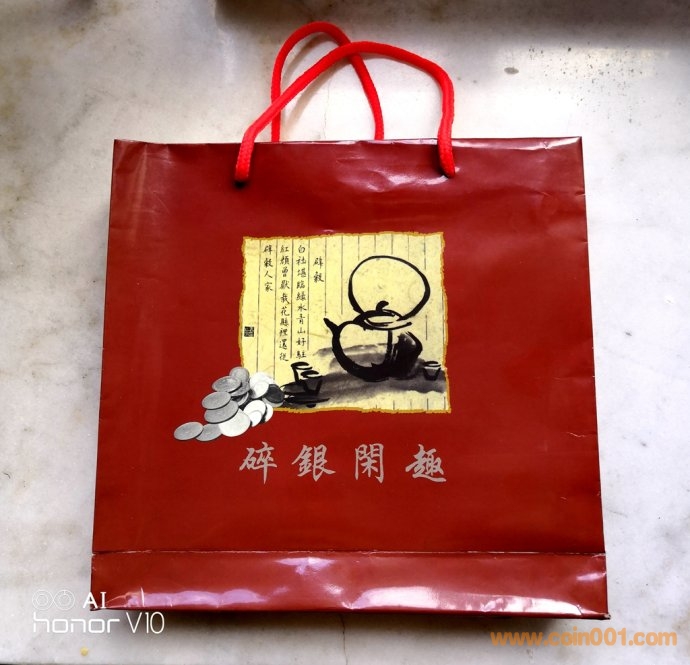 今從本網(wǎng)站、他網(wǎng)站偶得金、銀版《碎銀閑趣》數(shù)冊,“冊中詩文水墨與閑銀碎幣巧妙融合,無不浸透生活點滴帶來的閑情逸致和人生感悟,全冊詩情畫意,讀來趣味盎然”。上海老藏家印先生的除外包裝略微有些陳舊,其余品相精美,金冊與一市場常見略有差別,冊邊為銀色,91年、92年硬幣放置布局與常冊有異?!端殂y閑趣》發(fā)行于2000年,距今有23年了,我關注此冊也有15、6年了,但從發(fā)行到現(xiàn)在,關注度一直不高,各網(wǎng)站售賣的冊中硬幣也常常留有指紋,細微之處可見當時工人裝幀時的漫不經(jīng)心?!端殂y閑趣》裝幀的每枚硬幣、每張紙幣都熠熠生輝!