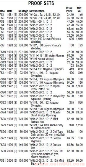 下附一張克勞斯目錄2000年以前日本精制套幣各年份發(fā)行量