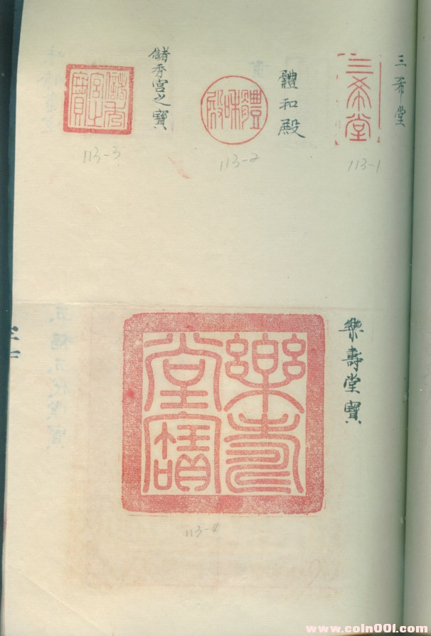 全印譜內容為明清帝后寶璽。其分類如下: 明代國寶璽印 55 枚; 道錄青詞鈐印諸璽 25 枚; 清代寶璽 37 枚; 宮殿名璽 40 枚; 康熙諸璽 24 枚; 雍正諸璽 25 枚; 乾隆諸璽 40 枚; 嘉慶諸璽 33 枚; 道光諸璽 9 枚; 咸豐諸璽 11 枚; 同治諸璽 10 枚; 光緒諸璽 7 枚 ;宣統(tǒng)諸璽 6 枚; 皇后嬪妃諸印 37 枚; 共計 359 個印文。其中著名的“清二十五寶”全部涵蓋,所鈐印與故宮博物院網上公布的尺寸一樣,均為明清帝后寶璽原鈐。另印鑒下均有手書文字釋文。毛筆小楷,字跡雅致,剛勁有力,十分罕見,具有非常重要的收藏價值。是研究書畫、印鑒的朋友們應該特別關注的精品。