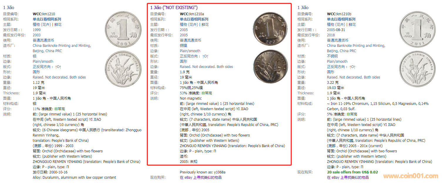 最近在《收藏家》網(wǎng)站看到了一枚從未見過的流通錢幣。2005年【銅鎳】蘭花1角。區(qū)別于鋁蘭和鋼蘭,它的材質(zhì)竟然是銅鎳的。我們可以注意到它標(biāo)注了"NOT EXISTING"(“不存在”)。但從網(wǎng)站提供的圖片來看,照片上的錢幣是實體,這說明這樣的錢幣確實存在,至少應(yīng)該存在過。