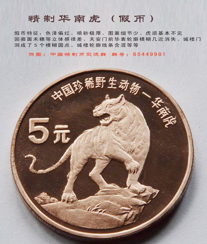 ????? ?圖紋不清??有圖案的一面,假幣的動物羽毛和翅膀等部位缺少細(xì)節(jié),華南虎幾乎不見虎須,朱鹮幾乎沒有水草,國徽年號一面更是區(qū)別非常明顯,禾穗立體感很差,天安門城樓前面的華表輪廓非常模糊幾近消失,城樓下5個門洞成了5個模糊圓點(diǎn),城樓輪廓也線條含混,這一面即使跟普制幣比,立體感和線條銳度都相差太多