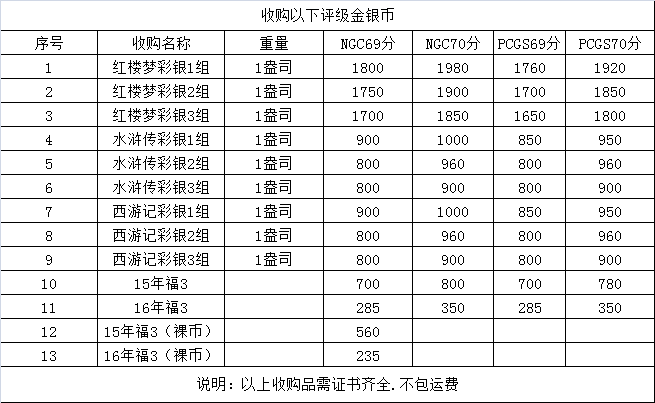 收購以下評級金銀幣