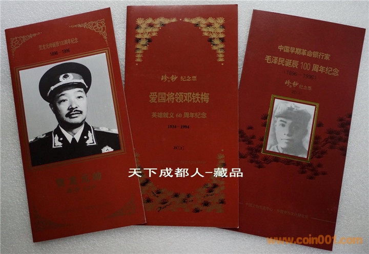 紅色珍鈔“Z”(珍)系列紀(jì)念票:九十年代中國文物交流中心、浙江省社會(huì)科學(xué)院中國貨幣文化研究所、上海印鈔廠等聯(lián)合制作發(fā)行《“Z”(珍)賀龍?jiān)獛洝⑻K維埃國家銀行行長毛澤民、愛國將領(lǐng)鄧鐵梅各珍鈔紀(jì)念票》各一冊共3冊/組;該紅色珍鈔均以其通用鈔票為歷史背景詳細(xì)圖文并茂介紹,真鈔高科技電腦制版印刷;各紀(jì)念票右側(cè)均印有瑩光古錢形“Z”(珍)防偽保值標(biāo)記,以資紀(jì)念。各珍鈔紀(jì)念券冊具有較高鑒賞學(xué)習(xí)收藏價(jià)值(品如實(shí)物圖):