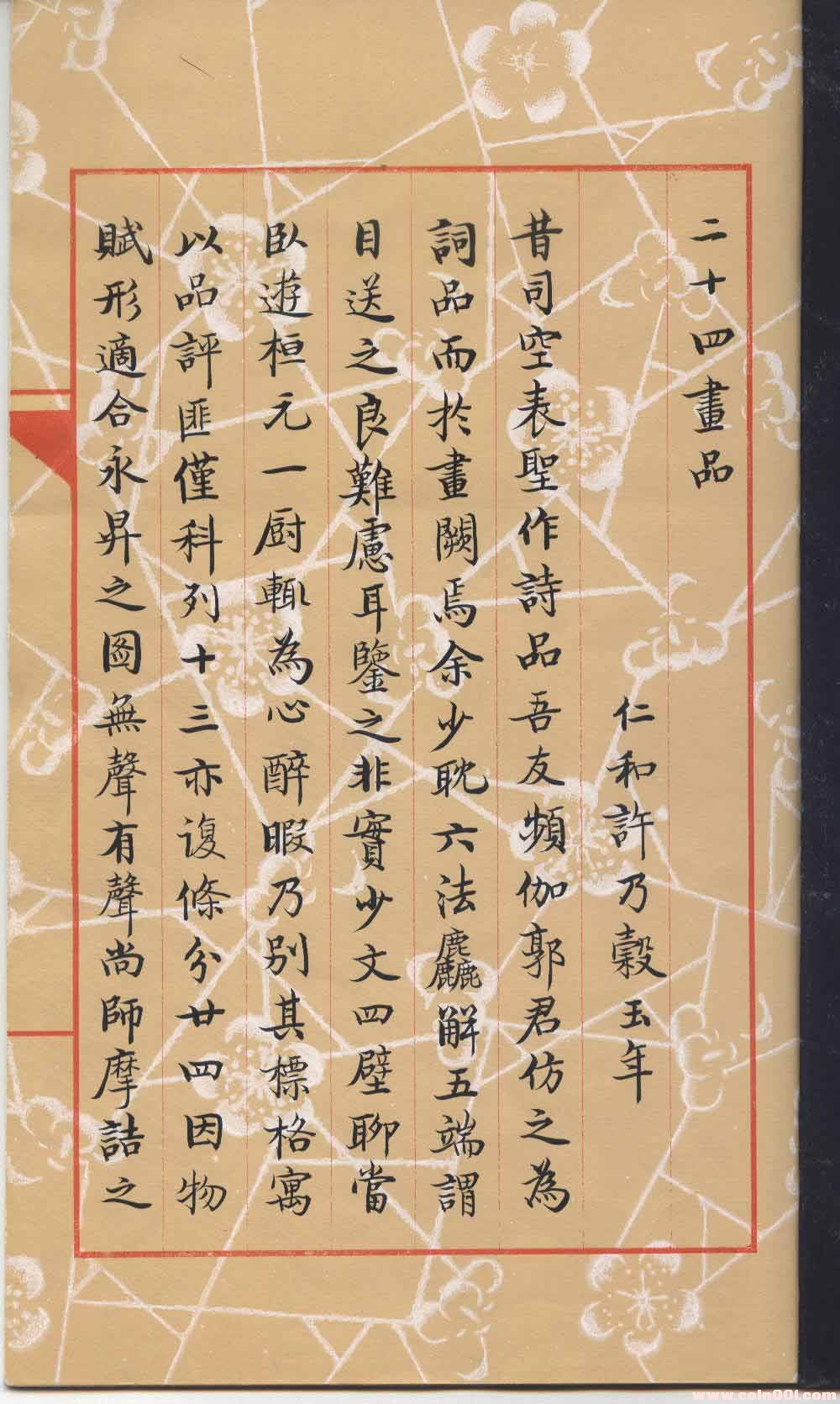 所謂二十四品者,曰氣韻、曰神妙、曰高古、日蒼潤(rùn)、曰沉雄、曰沖和、曰澹遠(yuǎn)、曰樸拙、曰超脫、曰奇辟、曰縱橫、曰淋漓、曰荒寒、曰清曠、曰性靈、日?qǐng)A渾、曰幽遂、曰明凈、曰健拔、曰簡(jiǎn)潔、曰精謹(jǐn)、曰儁爽、曰空靈、曰韶秀。每品項(xiàng)下各有四言釋義一篇,每篇一韻,每韻十二句,詞藻典麗,工整易誦。
