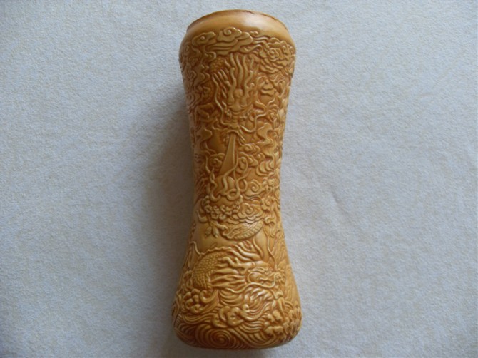 押花的制作原理與雕塑中的陽雕技法有些相似。先在一只葫蘆上畫出所需要的圖案,再使用瑪瑙、牛角制成的鈍刀器,(由于瑪瑙刀、牛角刀堅固而光潔,不宜損傷葫蘆的表皮。)以刀刃靠近圖案的外側(cè),沿圖案的邊緣,通過用力押、砑、擠、按葫蘆表面,過刀之處即會出現(xiàn)一條呈斜面的凹溝,圖案紋理就會凸現(xiàn)出來。使其表面呈現(xiàn)出紋理清晰、層次分明、立體感強,有如浮雕般的花紋圖案。