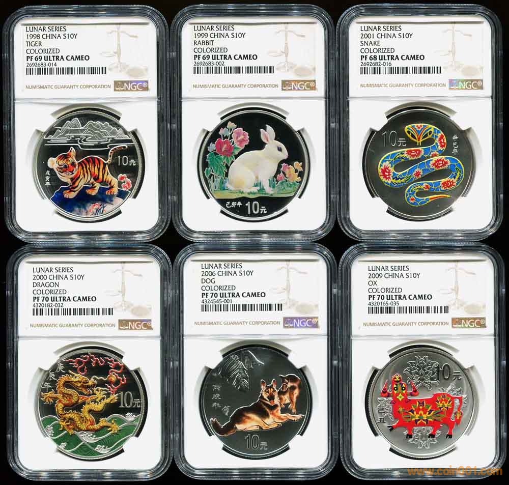 1999年彩銀虎 NGC PF69 3250/枚 帶證書1999年彩銀兔 NGC PF69 2250/枚 帶證書2000年彩銀龍 NGC PF69 2450/枚 帶證書2001年彩銀蛇 NGC PF68 1550/枚 帶證書2006年彩銀狗 NGC PF70 7500/枚 帶證書2009年彩銀牛 NGC PF70 5550/枚 帶證書