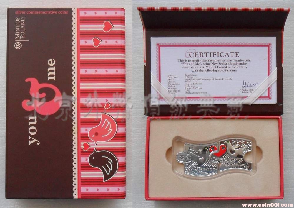 發(fā)行國家:紐埃 發(fā)行日期:2012年 目錄編號(hào):KM# -- 面值:1元x2 重量:14.14克x2 直徑:37.08x29.91毫米 含銀量:925‰ASW 發(fā)行量:精制級(jí)10000套 造幣廠:華沙造幣廠 包裝:原裝盒原證書 詳情:幣面鴿眼鑲嵌有2枚施華洛世奇水晶。 這對(duì)銀幣以拼圖互鎖的形式展現(xiàn),以此表達(dá)情人間的不離不棄和永遠(yuǎn)在一起的愿望和決心。 正面除了作為法定貨幣必須的元素之外,還有各種形狀各異的星心圖案。背面分別為兩只信鴿,眼睛用綠色施華洛世奇水晶鑲嵌。兩只信鴿分別銜著部分紅色心星組合成一個(gè)完整的心,象征和諧與完美。值得注意的是兩只鴿子分別采用了陰陽雕刻手法,與“你和我”的主題緊密相扣。 無論從設(shè)計(jì)圖案還是形制的組合,相信這一對(duì)精制銀幣都會(huì)是今年情人節(jié)的理想禮物。