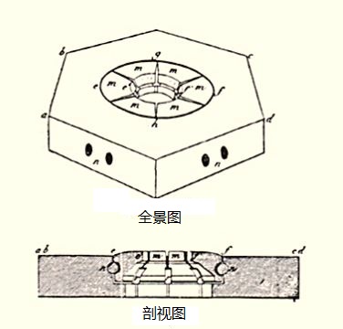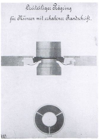 把雕刻圖案壓印到拋光的表面上以后,模體要車成一個圓柱體,圖案到底部的總長度要嚴(yán)格控制在規(guī)定限度之內(nèi),以便裝入新式壓機(jī)的圓形幣模夾具內(nèi)。到了十八世紀(jì)末,有車床可以承擔(dān)此項任務(wù)。造幣廠和幣模制造商對幣模模體的最佳形狀各有自己的看法。以壓印圖案為基準(zhǔn)來車出底部和模體對頂針車床操作工來說是技能要求很高的活。通常使用一個八爪卡盤來固定壓印好的幣模,而對模面邊緣進(jìn)行調(diào)整,使其轉(zhuǎn)動時一邊保持正確的角度,一邊和車床中心線對正,是件非常費(fèi)神的工作,圖 171。最后幣模還要硬化、淬火、裝在泥封的盒子里進(jìn)行回火處理。這些方法自古以來就沒有什么變化,在各地使用到 1900 年前后被液體鹽浴法所取代。(液體鹽中含有氰化鉀和其它鹽類。)雕刻好的模面在加熱和淬火之間暴露在空氣之中的問題依然存在,而且還需要快速淬火。在巴黎造幣廠,Droz 使用噴水技術(shù)來進(jìn)行淬火處理。140 年以后倫敦的皇家造幣廠還在沿用這一方法。其它各地的造幣廠也可能進(jìn)行了廣泛模仿。幣?;鼗鹛幚砗芎唵?,通常一批幣模被放在一個熱盤子上,抹了油的雕刻面朝上。盤子下面加熱到適當(dāng)?shù)幕鼗饻囟龋ǔ椤胞湺挕鄙〝z氏 205 度左右 – 譯者)。這樣做的結(jié)果是幣模根部的溫度要高于雕刻面的溫度,因此雕刻面能保持最大硬度,而根部則能保持最大的抗沖擊強(qiáng)度。
