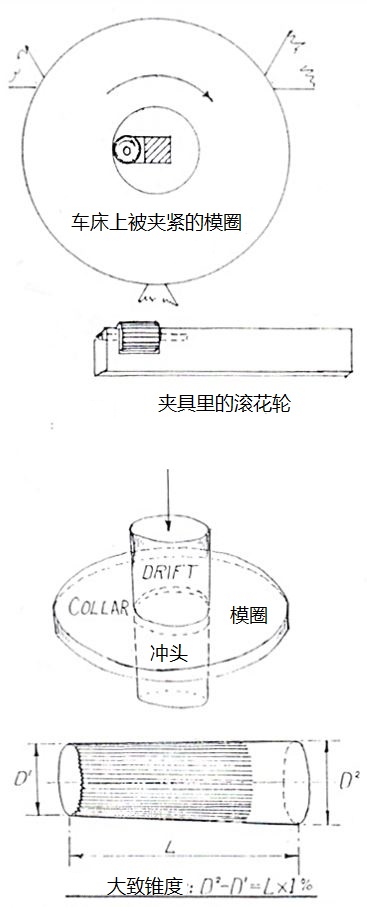 圖168 工作模翻制的幾個步驟。(1) 第一次壓??;(2) 退火;(3) 第二次壓??;(4) 形成圓臺;(5) 重新退火;(6) 第三次(最后)壓印。(1) 和 (3) 中的小圖是黑白示意圖,因而是陽紋,而不是工作模上應(yīng)有的陰紋。