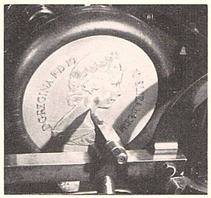 生產(chǎn)所需數(shù)量幣模的經(jīng)濟(jì)問題是這樣解決的:按照整個設(shè)計圖案制作一個陰紋原模,然后用陰紋原模再接連制作兩個幣模,一個上面是凸浮雕,又叫陽模。陽模被用來制作一個陰模,圖 165。原模是一個凹浮雕的手雕模,圖 166。手雕是一項技能高超的工作,因此需要 Pistrucci 和韋恩家族這些具有藝術(shù)才華的能工巧匠來為19世紀(jì)上半葉的硬幣制作原始幣模。原模又稱“母?!?,用一塊新鋼料雕刻而成,在淬火硬化后被置入一臺更大、更強(qiáng)勁的螺旋壓機(jī),又稱翻模壓機(jī)。在這臺機(jī)器中,它被用作幣模,把自身的圖案通過冷壓方式印制到稱為“父?!钡囊桓嗨其摿系腻F形拋光表面上。父模又叫二元模。二元模在硬化處理以后被用來壓制陰紋的工作模。每一枚幣都要有正面和背面幣模,而每一副模具的預(yù)期生產(chǎn)壽命是 25,000 到 50,000 枚硬幣。這種乘積效應(yīng)是驚人的– 一副制作優(yōu)良的父??梢陨a(chǎn)幾百副幣模、數(shù)百萬枚硬幣。如果父模磨損,還可以從原始的母模重新壓制父模來替代它們,圖 165。從理論上來說,這種做法能夠保證任何一種面值的所有硬幣都完全相同,但是雕刻師往往會修飾父模,因此造成微小的差別。這種制模的新方式的另一個優(yōu)勢,是設(shè)計圖案可以連續(xù)多年保持一致。不需要的年號可以從父模上磨掉,再用這個父模壓印新的母模。接下來只需要在新的母模上雕出新的年號,就可以用它來壓印新的父模。這個做法有一個小小的不利之處,那就是在每個步驟以后,設(shè)計圖案會向四周擴(kuò)展約 0.1%。這樣一來硬幣圖案珠圈周圍的內(nèi)齒就會略微縮小。一枚相同圖案的硬幣第二年及以后年份中發(fā)行時一般會顯示出這一區(qū)別。
