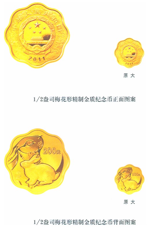 (七)1/2盎司梅花形金質(zhì)紀(jì)念幣為精制幣,含純金1/2盎司,外接圓直徑27毫米,面額200元,成色99.9%,最大發(fā)行量為8000枚。
