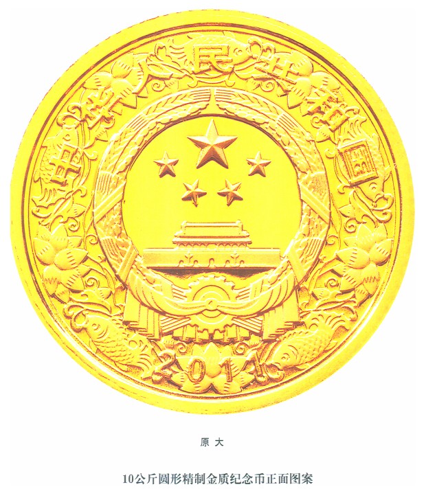 (十五)10公斤圓形金質(zhì)紀(jì)念幣為精制幣,含純金10公斤,直徑180毫米,面額100000元,成色99.9%,最大發(fā)行量18枚?! ?