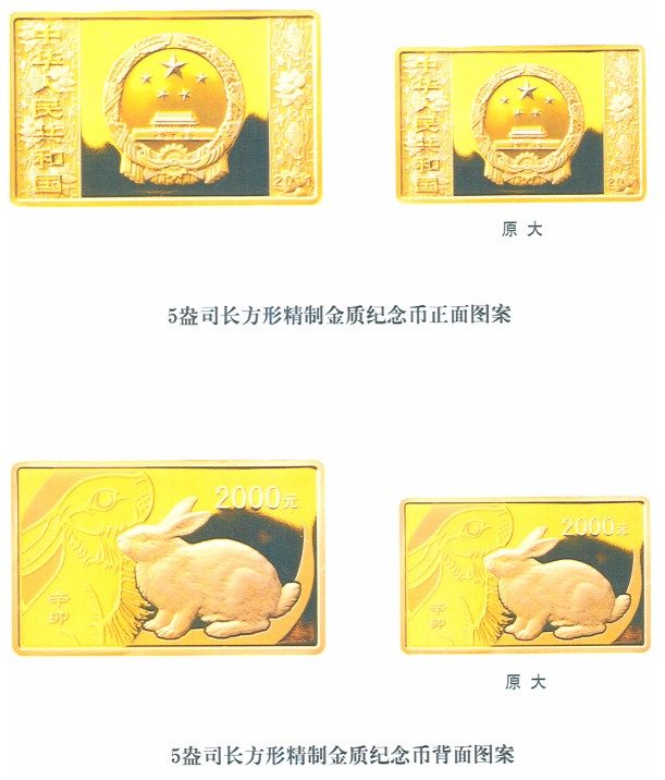 (九)5盎司長方形金質(zhì)紀(jì)念幣為精制幣,含純金5盎司,規(guī)格64毫米×40毫米,面額2000元,成色99.9%,最大發(fā)行量118枚?! ?
