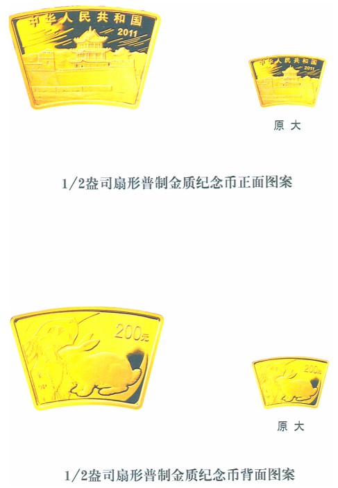 (五)1/2盎司扇形金質(zhì)紀(jì)念幣為普制幣,含純金1/2盎司,外圓半徑58毫米,內(nèi)圓半徑39毫米,圓心角30度,面額200元,成色99.9%,最大發(fā)行量6600枚?! ?
