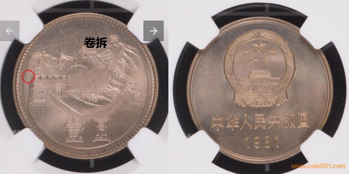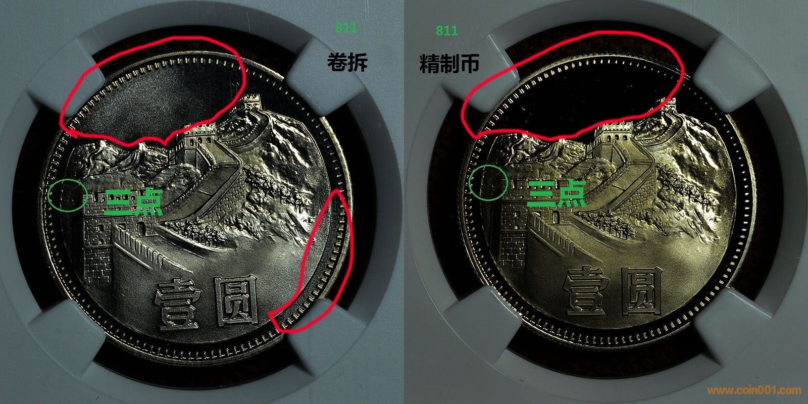 4、“三點(diǎn)”特征只有上海版1980/1981/1982/1983/1984長(zhǎng)城幣五個(gè)年份的才有,且對(duì)應(yīng)年份的普制幣和精制幣都有,到上海版1985普制幣,就已經(jīng)沒(méi)有這個(gè)“三點(diǎn)”特征了,而是啟用了沒(méi)有“三點(diǎn)”凸起的新模具;