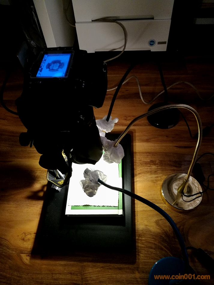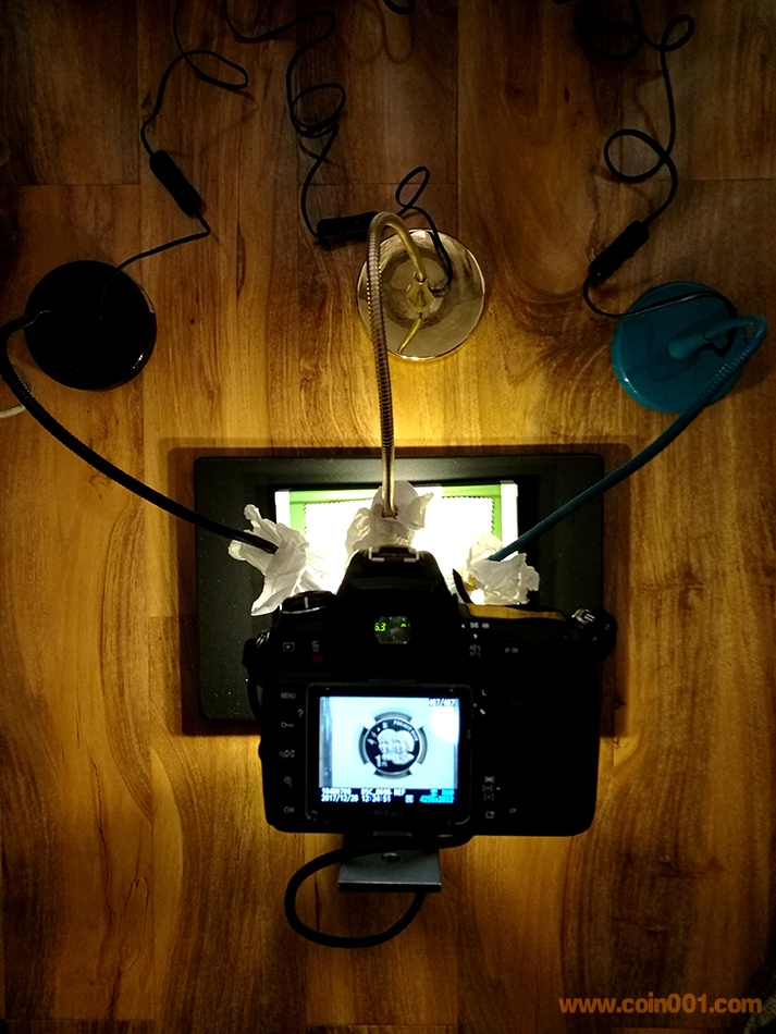 我使用了三盞宜家LED燈拍攝,其中一盞位置高,兩盞位置低,高位置的燈源照射方向盡量與幣面垂直,以照亮幣整體全貌;低位的燈分別放在幣的兩側(cè),呈大約45度的角度照射幣面,主要作用是照射幣面細(xì)節(jié),便幣的細(xì)節(jié)更加清晰,同時(shí)使圖案更具立體感。