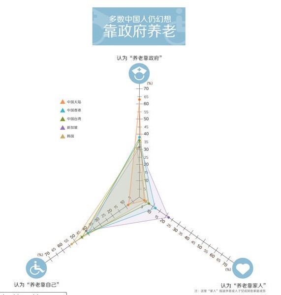 調(diào)查發(fā)現(xiàn),相比其它東亞國(guó)家受訪者,中國(guó)受訪者在養(yǎng)老問(wèn)題上對(duì)國(guó)家抱有最大的幻想,盡管中國(guó)的退休養(yǎng)老制度有很大的缺陷。當(dāng)問(wèn)到“養(yǎng)老靠誰(shuí)”的時(shí)候,63%的中國(guó)受訪者的認(rèn)為“養(yǎng)老靠政府”。而在香港、臺(tái)灣、新加坡和韓國(guó),認(rèn)為“養(yǎng)老靠自己”的人占40%-53%,都比認(rèn)為“養(yǎng)老靠政府”的人要多。在馬來(lái)西亞,31%的人認(rèn)為“養(yǎng)老靠自己”,比中國(guó)的9%高出不少。