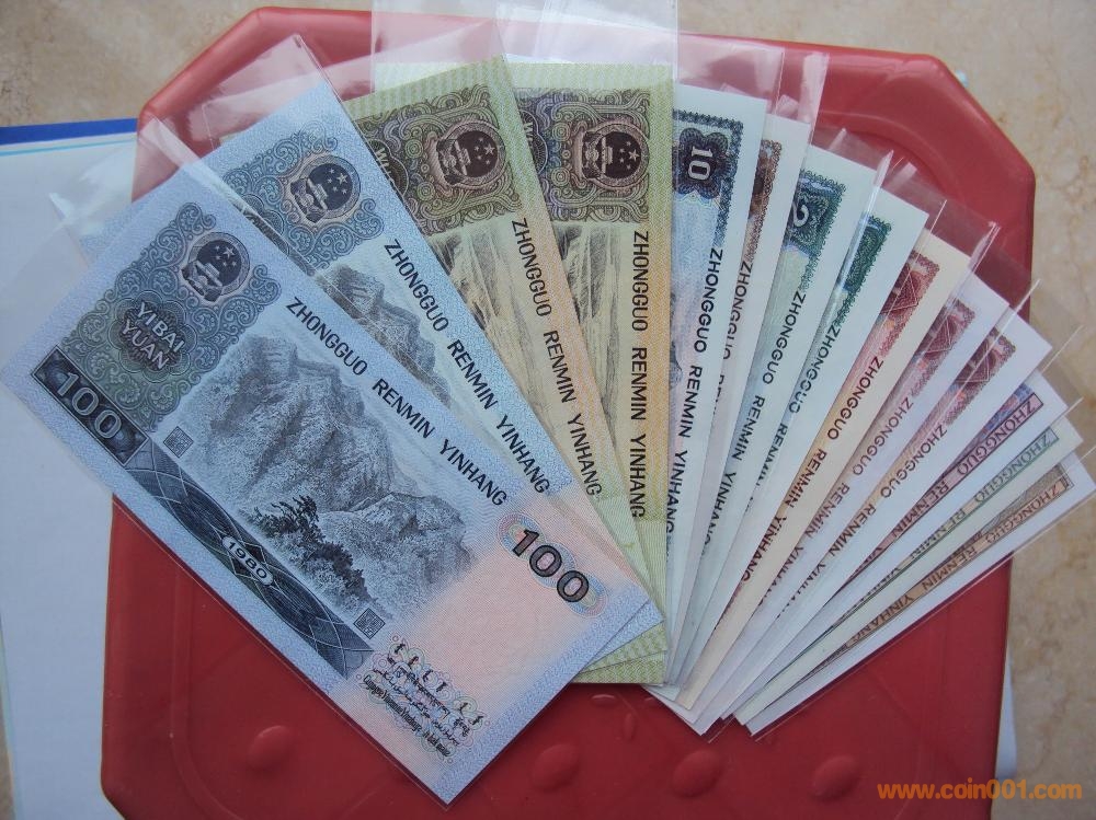 備注:1)80版+90版100元劵各一枚;(2)80版+90版50元劵各一枚;80版50元(第四人民幣鈔王,罕見)(3)80版10元劵一枚;(4)80版5元劵一枚;(5)80版+90版2元劵各一枚;(6)80版+90版+96版1元劵各一枚;(7)80版五角劵一枚;(8)80版兩角劵一枚;(9)80版一角劵一枚;(10)紙分幣三張.最大特點:中國人民銀行發(fā)行的第四套人民幣全套九種劵別“末三位”數(shù)字編號全部相同