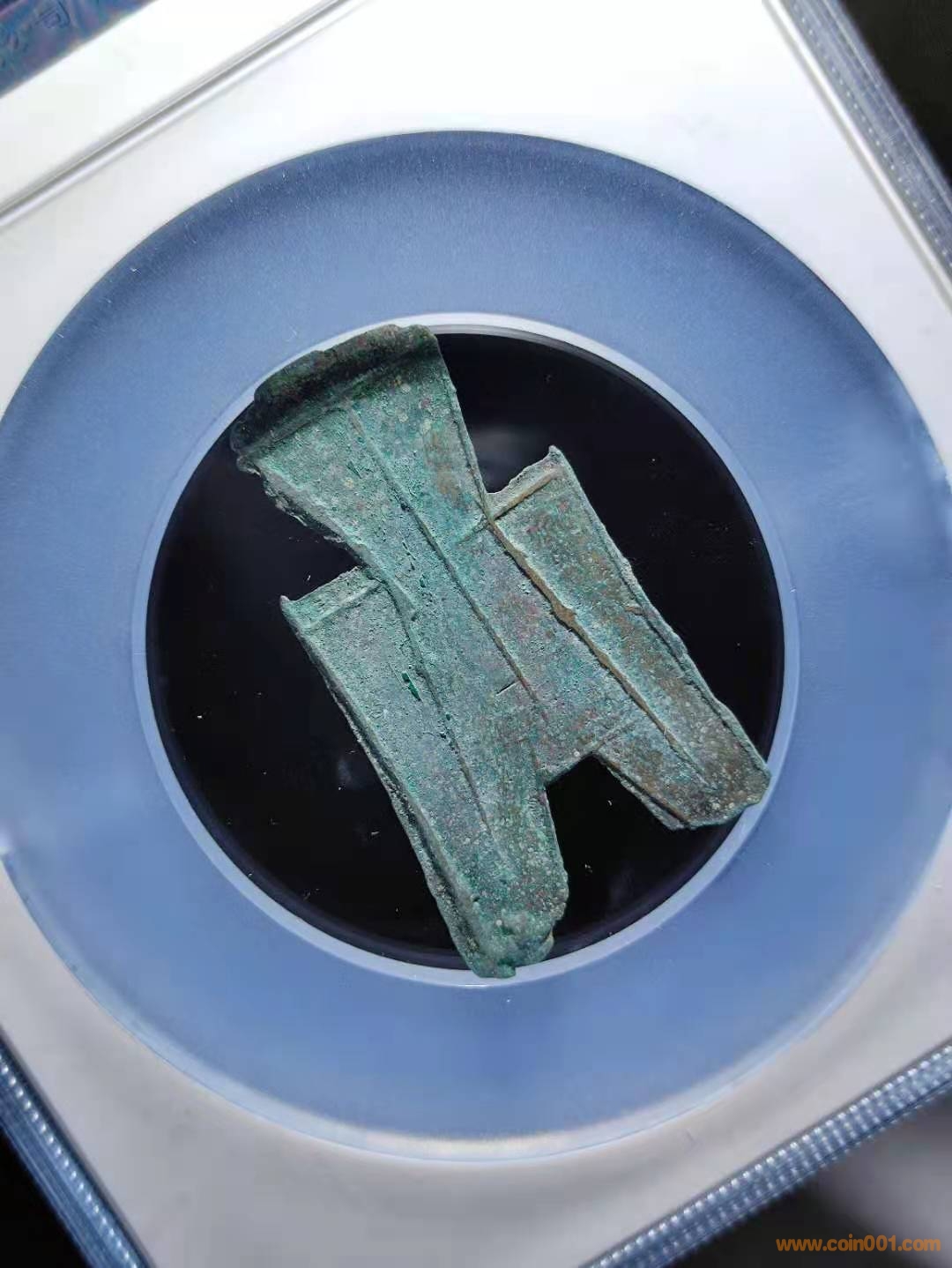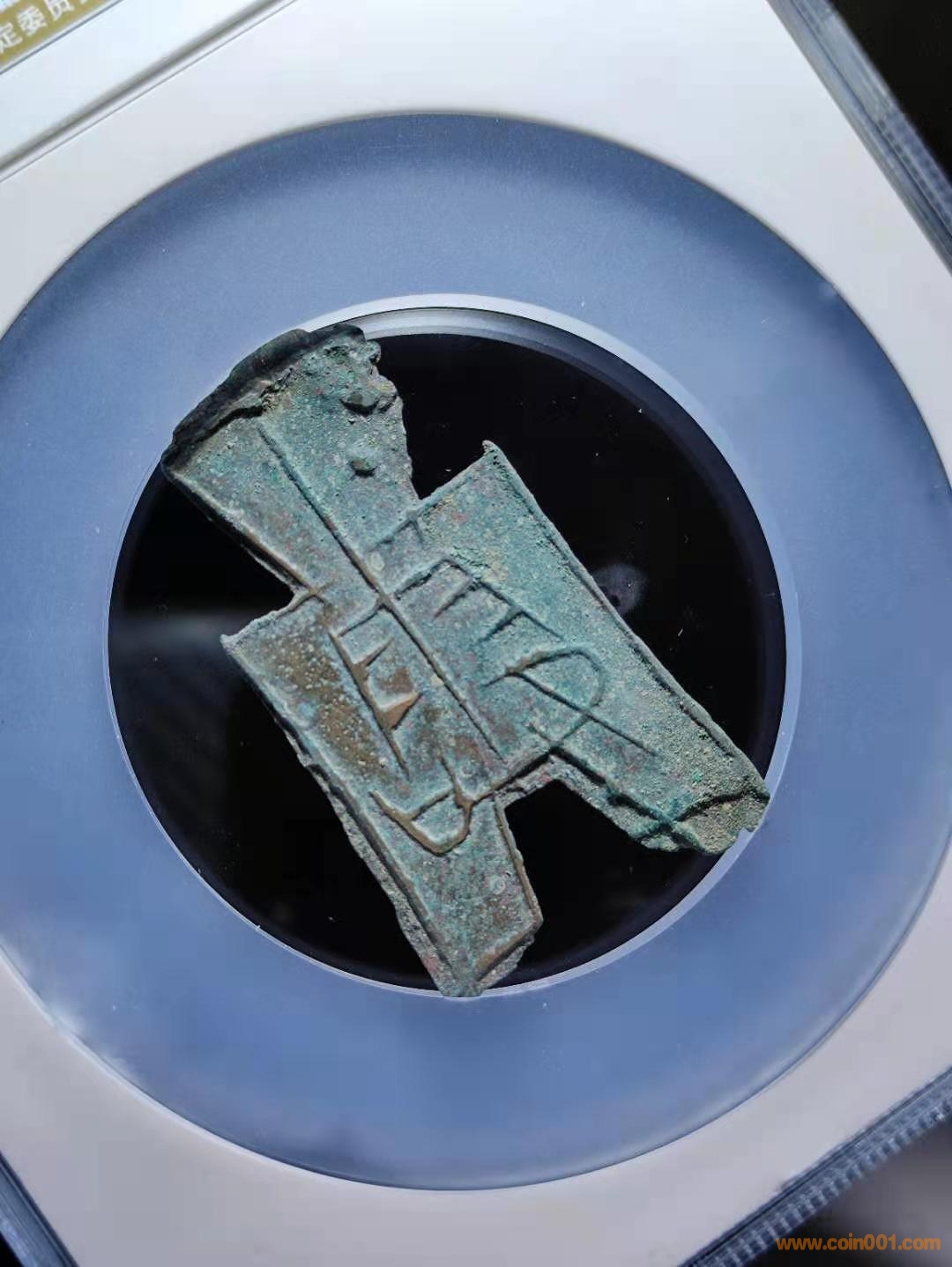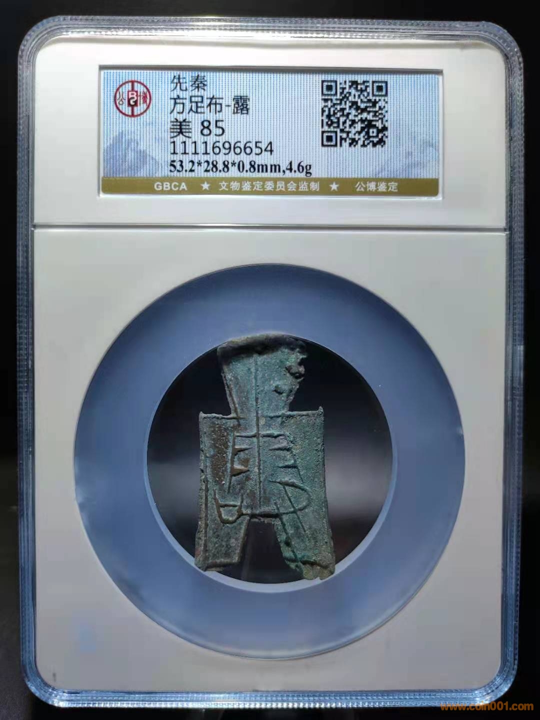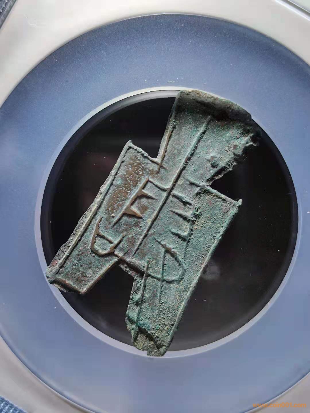 生坑薄綠銹入骨十分,錢文挺拔高聳有力,筋線完好略有移范。從澆口、邊線毛刺存留,超高的尺寸數(shù)據(jù),可窺探無流通之筋骨,銹色透出京坑之精氣神。據(jù)考“露”為戰(zhàn)國時(shí)期古地名,即今山西省長治市潞城縣境內(nèi)東北。戰(zhàn)國初此處屬晉國,后被趙、魏、韓三分晉地,戰(zhàn)亂紛爭群雄爭霸,“露”曾被趙國和韓國幾經(jīng)易手,故其鑄造歸屬是趙還是韓,無直接確鑿證據(jù)予以確定。此品為方足布少見項(xiàng),存世字口普遍模糊,形態(tài)絕佳者則寥寥無幾。