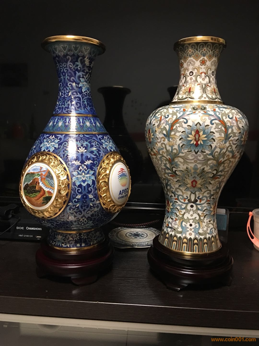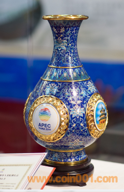 《四海升平》景泰藍(lán)賞瓶瓶身38厘米高,為天壇祈年殿38米身高的等比例縮小。賞瓶最大直徑21厘米,代表APEC的21個(gè)成員。器型四面開光,周圍以浮雕吉祥水紋環(huán)繞,象征“四海”,寓意太平洋,“瓶”即“平”,整體即四海升平。開光部分正面為本屆APEC會(huì)議標(biāo)志,背面為北京雁棲湖APEC主會(huì)場,兩側(cè)分別為北京標(biāo)志性建筑天壇和懷柔慕田峪長城。根據(jù)國際慣例,歷年度亞太經(jīng)合組織會(huì)議的東道主領(lǐng)導(dǎo)人及配偶,都要為參加APEC的各成員領(lǐng)導(dǎo)人及配偶,贈(zèng)送體現(xiàn)本地歷史文化或自然風(fēng)貌的特色紀(jì)念禮品。《四海升平》景泰藍(lán)賞瓶典藏版作為APEC國禮運(yùn)營,全球限量發(fā)行、具有極高的藝術(shù)性、鑒賞性和收藏性。