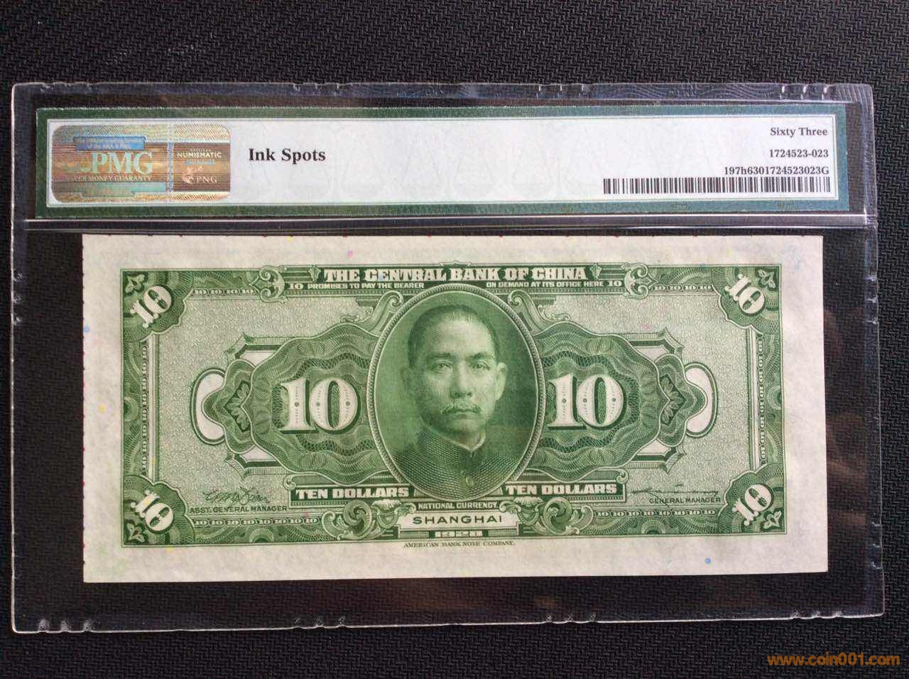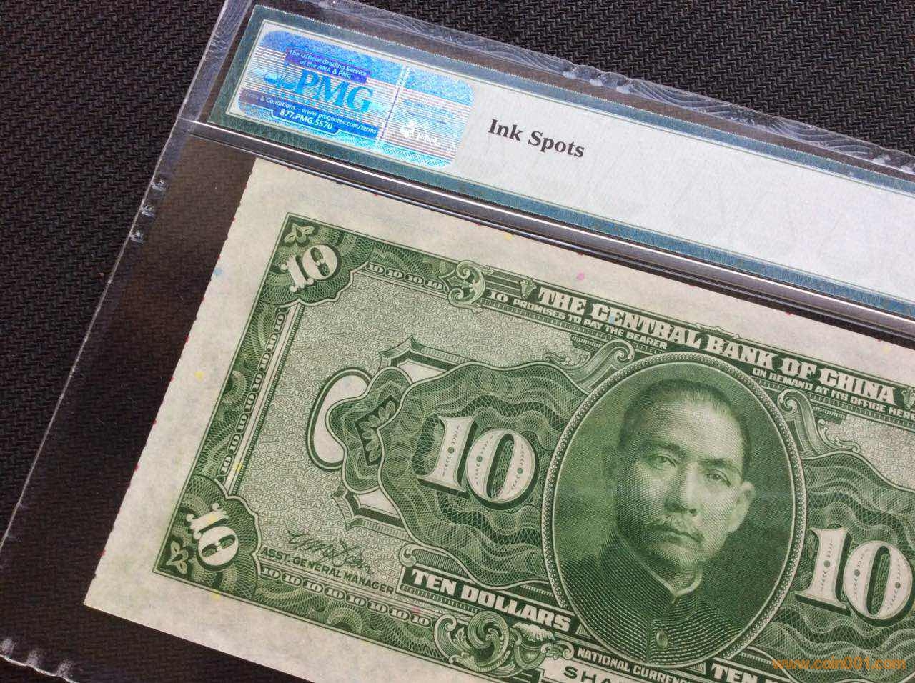1928年中央銀行美鈔版拾圓加蓋上海地名,凹版印刷采用帶彩色斑點鈔紙印制。鈔票正面上、右側(cè)在出廠裁切中留有色標(biāo),評級說明中有l(wèi)nk spots標(biāo)注,可當(dāng)趣味品收藏品鑒!全新原票無人為未流通!